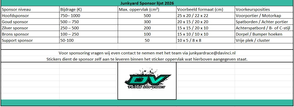- zichtbaarheid tijdens de Junkyard Race en in ons netwerk rond het raceweekend